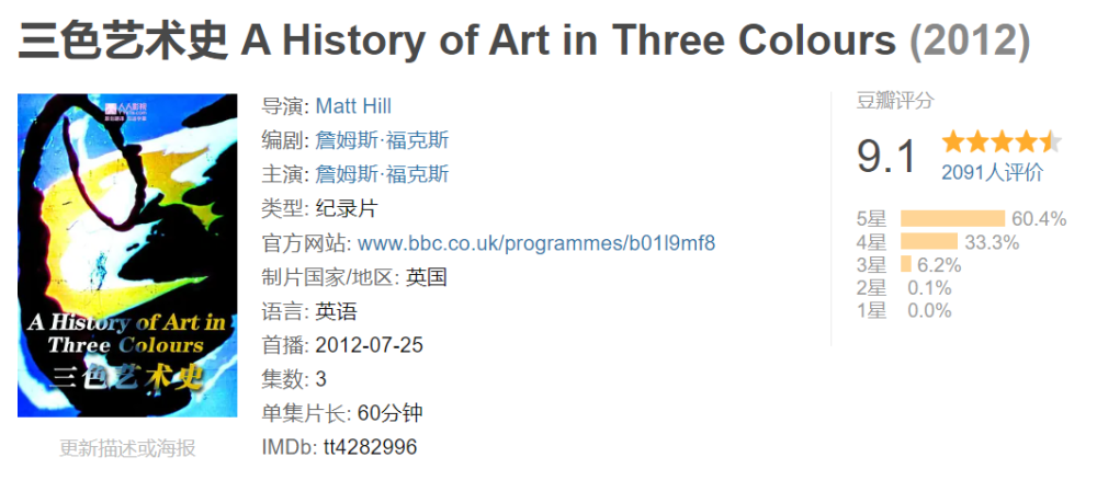 金色,蓝色,白色,不仅仅是三种颜色,更是历史长河中赋予了艺术家无限灵感的色彩,BBC的系列纪录片《三色艺术史》讲述了这三个颜色的故事,以及它们如何影响人们的生活和行为,甚至影响、改变了人类历史进程的色彩。纪录片以每种颜色为主轴,跨时间、跨地域的讲述了它们在艺术创作中的应用。