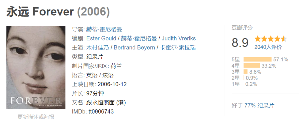 《永远》以其宁静优美的视角,让我们讲述着爱与死亡交融生辉的不朽艺术。本片荣获2006年荷兰乌特勒支纪录片节最佳纪录长片、最佳剪辑提名等,又在2007年美国Full Frame纪录片节灵感奖等多项大奖。