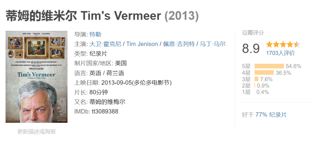 著名魔术师与揭秘组合潘恩&泰勒联手探究荷兰著名画家维梅尔,试图找出其画作得以捕捉完美光线后的原因。他们还请来发明家蒂姆·詹尼森利用光学仪器复制维梅尔的油画,完美重现名作风采。