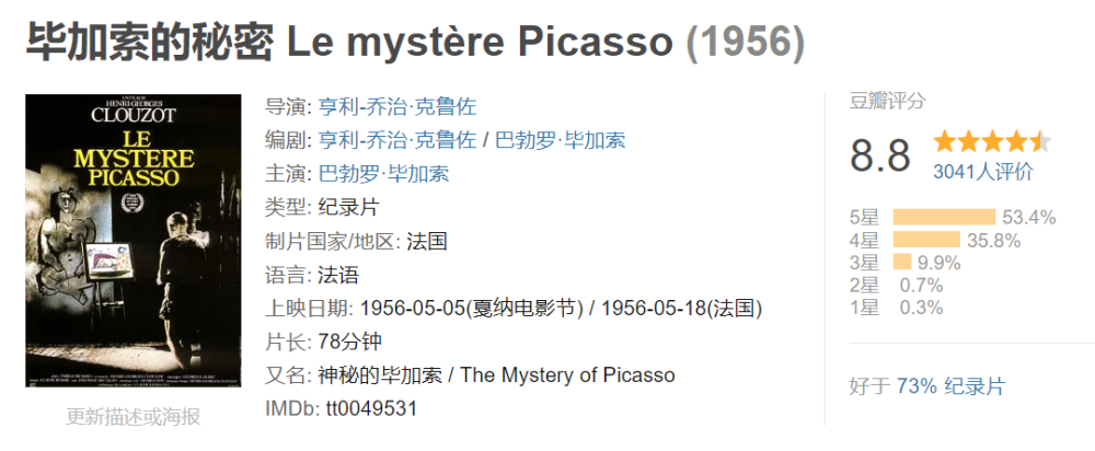 以悬疑片的手法记录了西班牙画家毕加索(1881—1973)的一次作画过程。1956年盛夏,在法国南部海滨城市尼斯的一间画室里,面对难耐的酷热及聚光灯的强烈辐射,毕加索兴致昂然地挥笔作画:生动的线条在画纸上迅速游走和变形,一朵花先是变成一条鱼,接着变成一个美人,然后变成一只公鸡,最后变成了牧神。本片导演亨利—乔治·克鲁佐(Henri-Georges Clouzot,1907—1977)以拍摄悬疑片著称(据说希区柯克眼中的竞争对手只有一人,他就是克鲁佐),代表作有《乌鸦》(1943)、《恐惧的代价》(1953)等。
