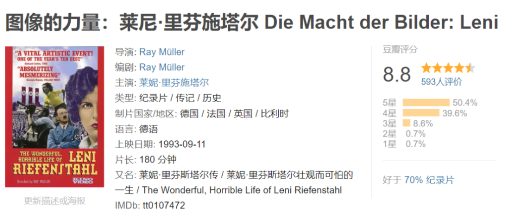 她的争议来自于为电影事业所作出的贡献和她间接对人类“犯下的罪行”。在动乱的年代里,里芬斯塔尔的电影风格受到元首希特勒的赏识,因此受邀为纳粹拍过多部歌功颂德的纪录片,如《意志的胜利》和《奥林匹亚》。凭借帝国的支持,里芬斯塔尔创造性地将电影美学提升到前所未有的高度,而这些影片也成为战后饱受诟病的魔鬼作品。