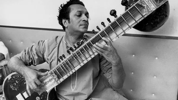 年轻时的拉维香卡,怀里抱着的就是西塔琴