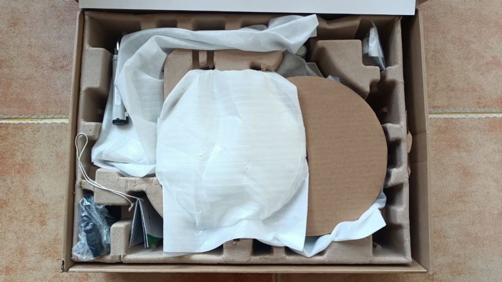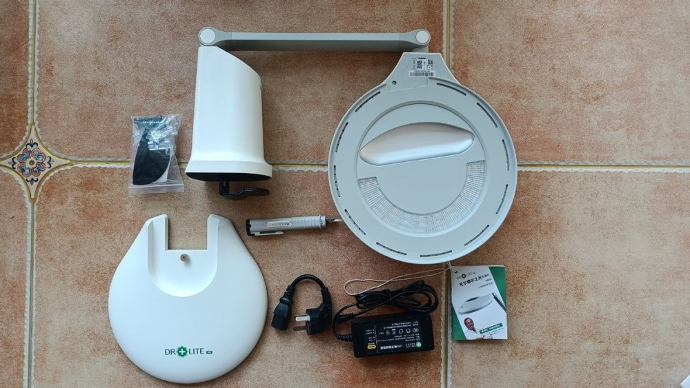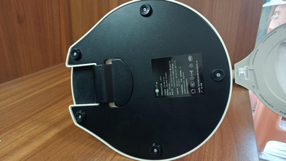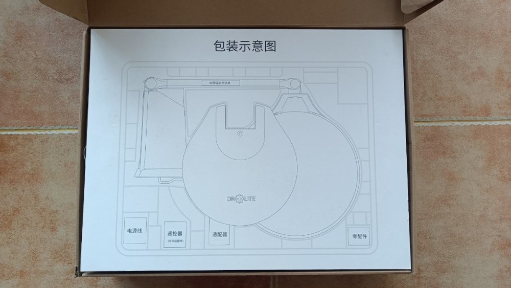 盒内组件放置包含底座、一体式灯盘灯柱、电源适配器、说明书、还附赠有一根电磁辐射测试笔和带3M双面胶的理线扣。