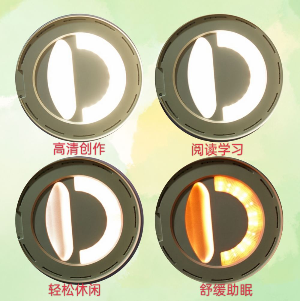 四种光照模式,基本能满足孩子日常生活和学习的需要。像孩子平时阅读学习模式用得比较多,这个模式下的光线非常均匀柔和,而且是4000k的白光,能提高孩子的专注力和身体状态。学习累了之后,就可以打开舒缓助眠模式,这个模式下的光线是1800k的烛光设计,光线让人非常舒适和放松,在这种光线下,能帮助人快速恢复状态。