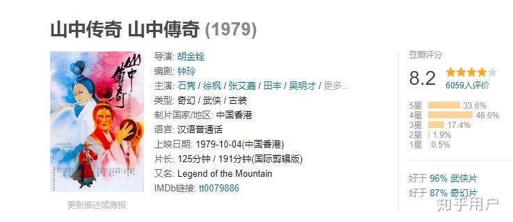 片子豆瓣评分8.2分,有2个版本,112分钟和191分钟,建议看后者,胡金铨是一个用现代电影书写中国古典文化的艺术家,《山中传奇》的叙事是充满诗意性的,191分钟的版本可以让我们窥探出导演精致到骨子里的韵味,从而进入到一个空灵而清澈的江湖世界。