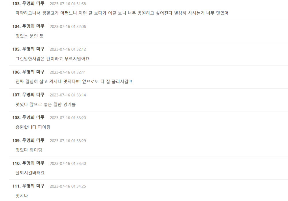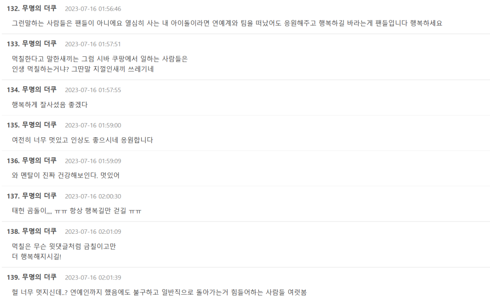 而7月16日,该采访经过韩媒曝光后,立即引起韩网热议,大量网友留言表示:“真的很努力的在生活,太帅了”、“说那种话的人请不要叫粉丝”、“加油”、“太酷了,很多当过艺人的人很多很难回到普通岗位上堂堂正正的生活”、“不知道写恶评的人什么心思,但那位好像在发光啊”等等。