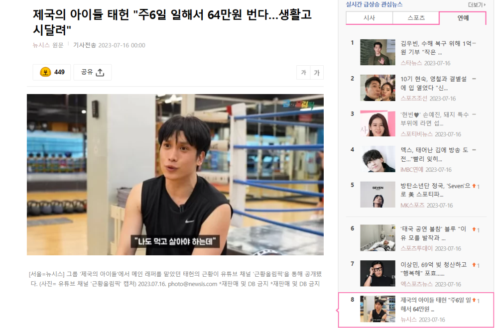 对此,在7月15日播出的某韩国网综艺中,当事人金泰宪先是透露了自己在退伍后已经很久没有站在镜头前工作了,所以面对这次访问前一夜根本没有睡好很紧张,点出了他演艺事业的窘迫状况。