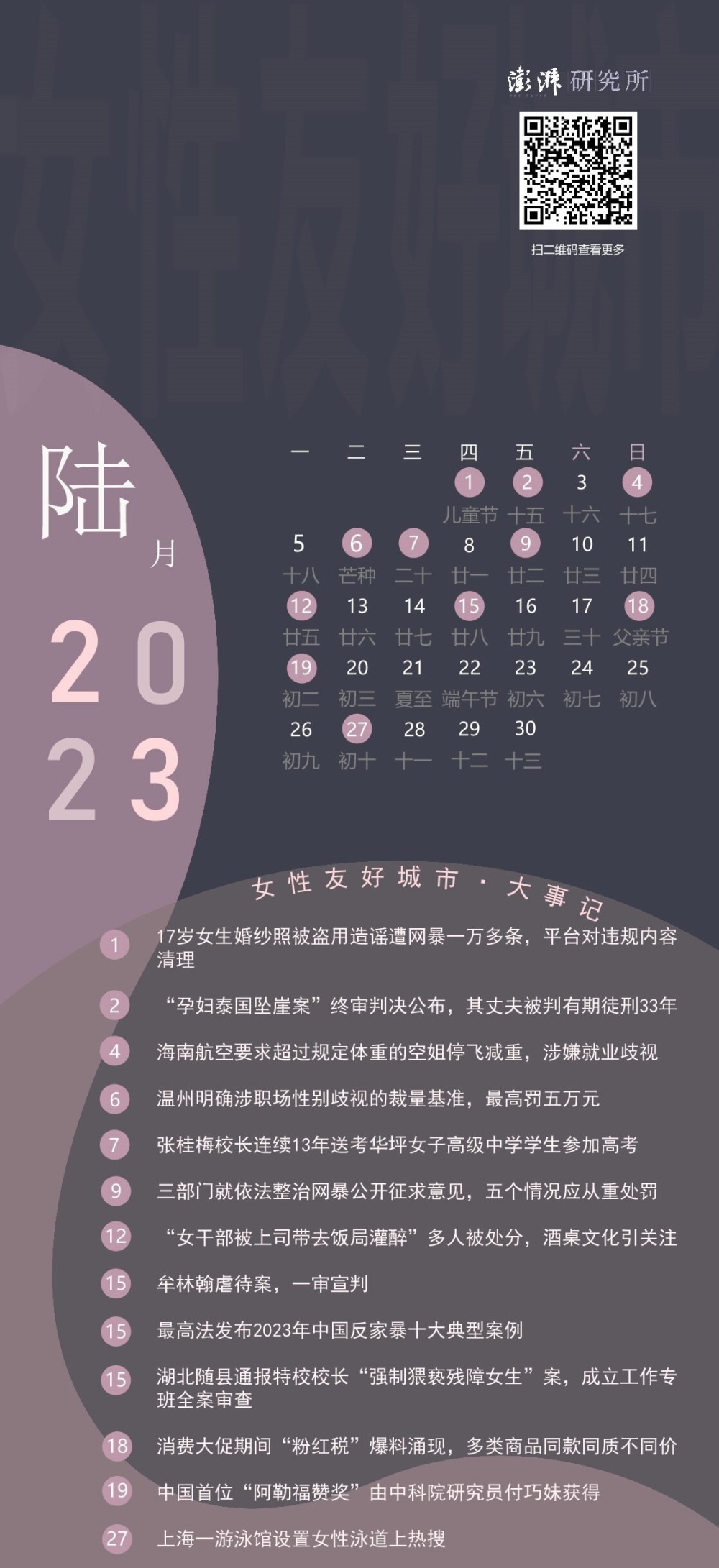 澎湃研究所每月推出建设女性友好城市事件整理,持续关注女性处境,探讨女性议题,为建设女性友好城市建言献策。