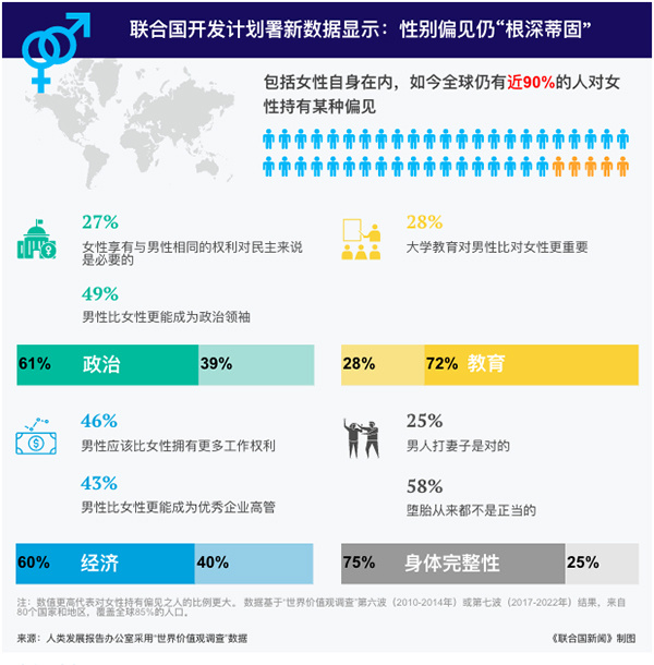最新版“性别社会规范指数”报告中指出,包括女性自身在内,如今全球仍有近90%的人对女性持有某种偏见,这一情况在过去十年当中未得到改善。