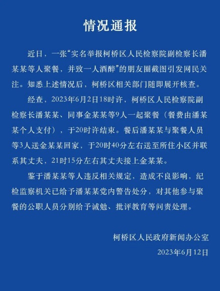 后柯桥区人民政府新闻办公室发布情况通报称,鉴于潘某某等人违反相关规定,造成不良影响、纪检监察机关已给予潘某某党内警告处分,对其他参与聚餐的公职人员分别给予诫勉、批评教育等问责处理。
