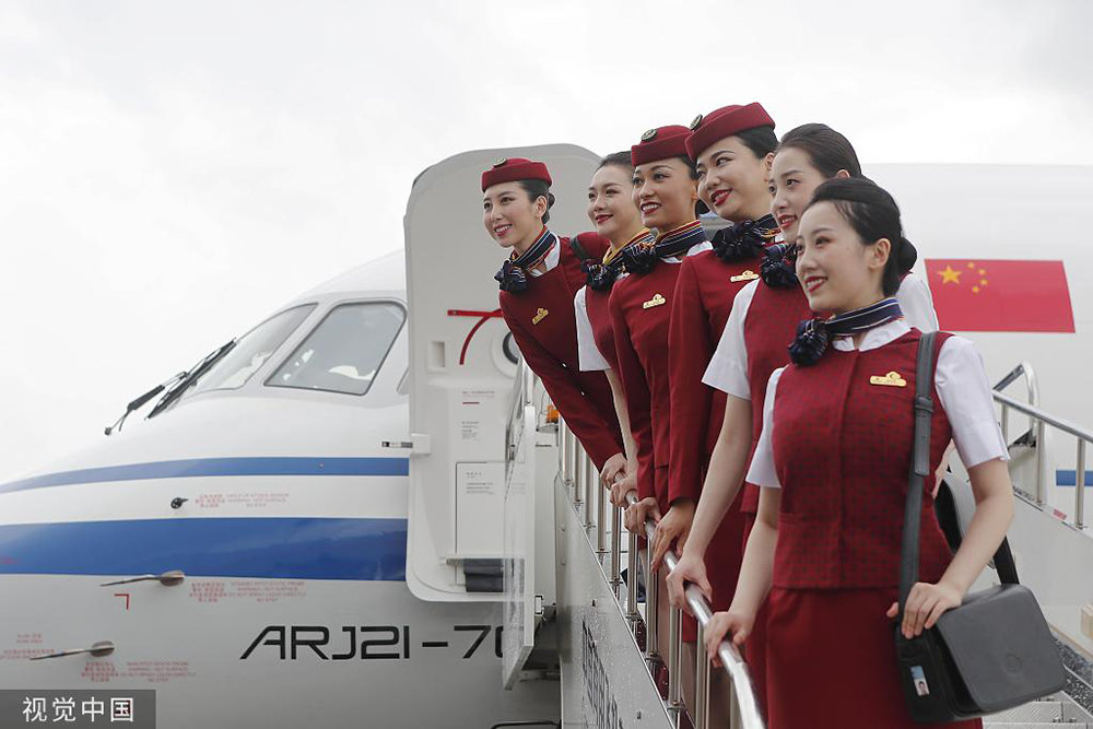 国航乘务员在国航首架ARJ21客机前合影留念。 殷立勤(上海分社)/中新社? 资料图