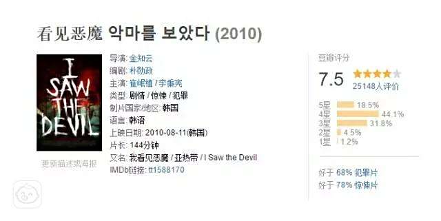 今天叨叨的金导另一篇动作片——《看见恶魔》(2010),则完全展现了上述特征。豆瓣评分7.5,几乎是金导所有作品中豆瓣评分最高的一部。