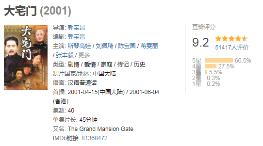 读书的时候模模糊糊看过一遍,后来偶然想起又重新再刷。对比现在的国产电视剧市场,《大宅门》比它们不知道高到哪里去了。先上豆瓣评分,虽然不一定客观,但足以说明这部剧有多受欢迎,超过五万人评价还拿到66.5%的5星好评。