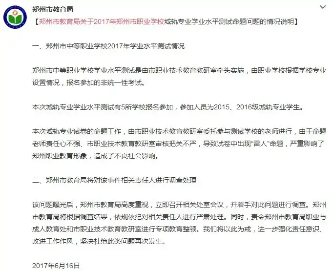 这事儿一出,郑州市教育局就着急了,表示这是“由于老师责任心不强”,“试题审核过程中把关不严”。郑州市教育局就“放水”试题发布情况说明 | 微博截图