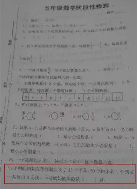 徐州睢宁五年级数学考试题:“小明妈妈在超市买了15个苹果、20个桃子和1个西瓜,一共付8块钱。小明妈妈的年龄是几岁?”某小学五年级数学考试题 | 视觉中国