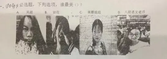 前不久,南京市江宁区一所小学三年级语文测试卷中,第一题就是让学生从“凤姐”、“如花”、“芙蓉姐姐”、“八班语文老师”中选出谁最美,这题与凤城中学物理老师的那道如出一辙。