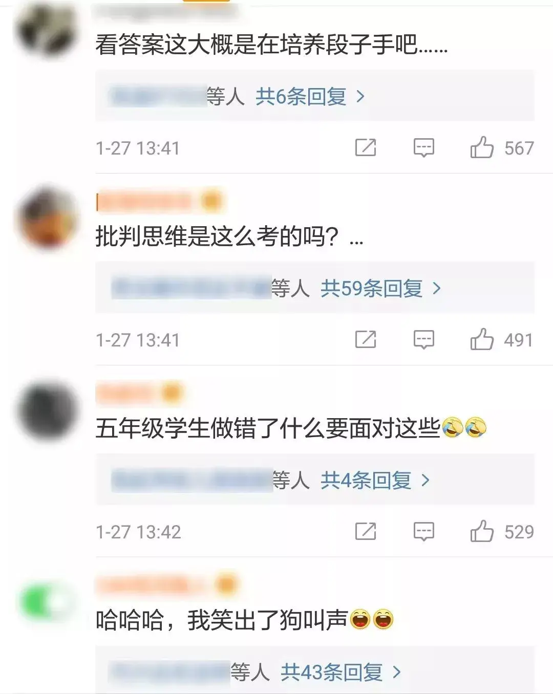 从小学到大学,我们都难逃“神考题”的魔爪,甚至,司法考试考过“母亲和女友身处大火应救谁”,公务员考试出现“一只熊,掉进一个陷阱,陷阱深19.6米,跌落的时间2秒钟,请问熊什么颜色”。网友对于猜船长几岁的小学考题的评论 | 微博截图