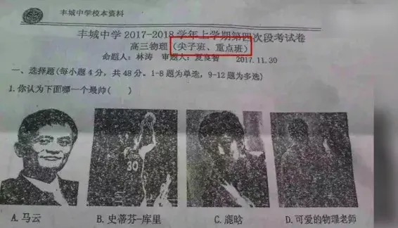 不仅是小学生,某中学2017-2018学年上学期的考试卷中,第一道选择题是需要学生从“马云”、“库里”、“鹿晗”和“可爱的物理老师”四个选项中选出最帅的一个。出题人老师表示“就是想让大家放松一下” | 视频截图