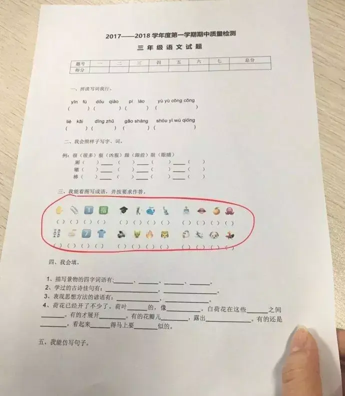 试卷中的一道成语题,居然是以emoji表情符号组合提问的,这样的操作让妈妈担心起了老师的教学态度。