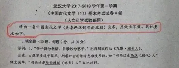 最近,在某大学2017级人文科学实验班《中国古代文学》的期末考试中,考生需要自己出一套试卷并做出答案,其中包括了10道填空题、4道名词解释题、4道简答题、1道论述题。