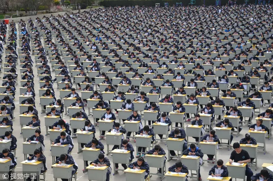 如果媒体新闻例子泛滥,本为了巩固知识点的试卷就会成为花样百出的街头小报,分散学生的注意力,使他们放松散漫,无法潜心对待学习。 2015年4月11日,宜川中学,1700余名学生整齐有序地在操场上露天考试 | 视觉中国