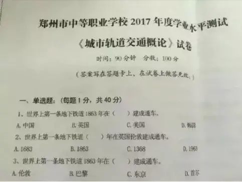 去年年中,郑州市某学校的年度水平测试受到了极大的关注,这皆因《城市轨道交通概论》中的前三道单选题几乎一模一样。