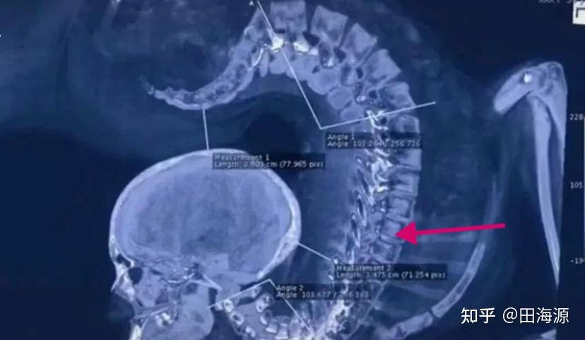 这是一个13岁的优秀小舞者的脊柱,比50岁的颈椎情况还要糟糕。13岁女孩,颈椎反弓、胸椎曲度变直、腰椎曲度变直